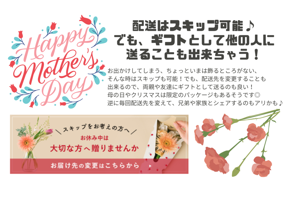 ただスキップするだけじゃもったいない!可愛いお花を離れた家族にプレゼントも出来るよ!マツ子さんも次にスキップが必要な時は実家に送ろうと思っています♪