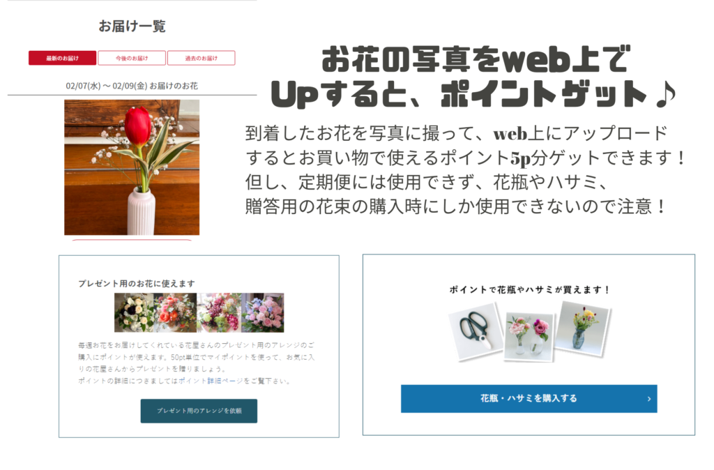 花瓶や花束は、結構いいお値段のものも多いので、いまのところなかなか使う機会がないです・・・。欲張っていえばこのポイントも、定期配送の割引とかで使えると凄く嬉しいけど(; ・`д・´)